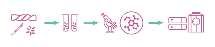 Partiendo de la porción de cordón recolectada, el tejido es procesado seleccionando los mejores sectores de la muestra para obtener luego la mayor cantidad de células posibles y de la mejor calidad.